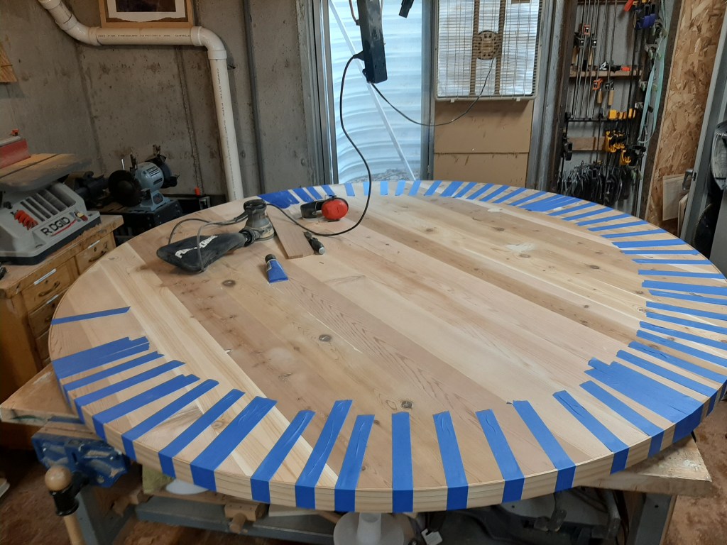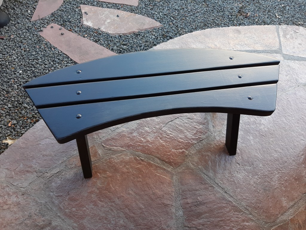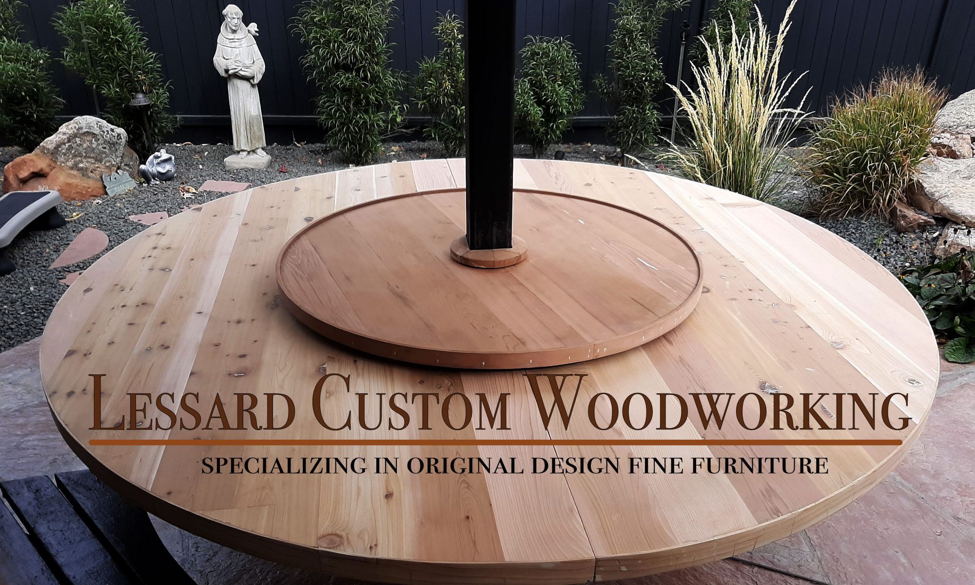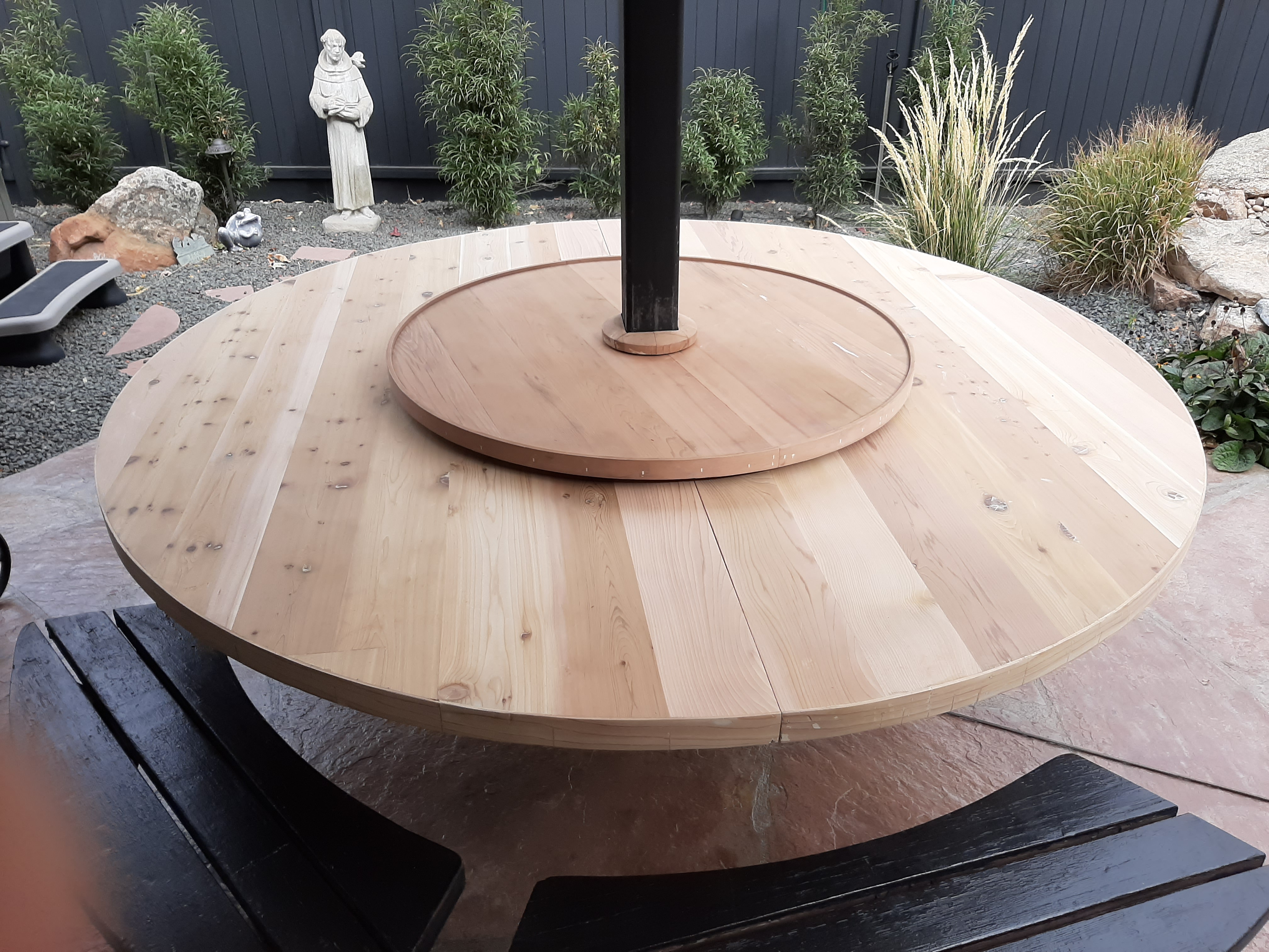 This is the project that got it all started. This client bought his parents house and wanted to increase the size of his patio table. What once seated four tightly now seats 10 easily. This 80 inch diameter cedar table was so big I could not move it from my shop to his house without taking it apart. To honor his parents I used the old table to build the Lazy Susan . The client painted the table black to match the benches. I also build three more benches so everyone would have a place to sit.