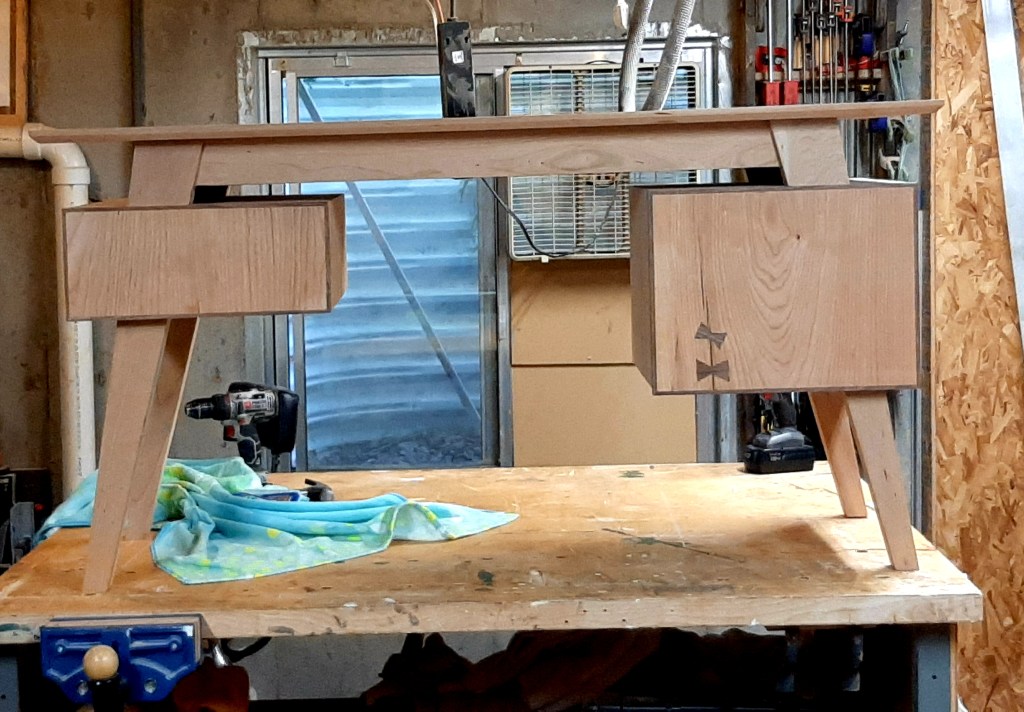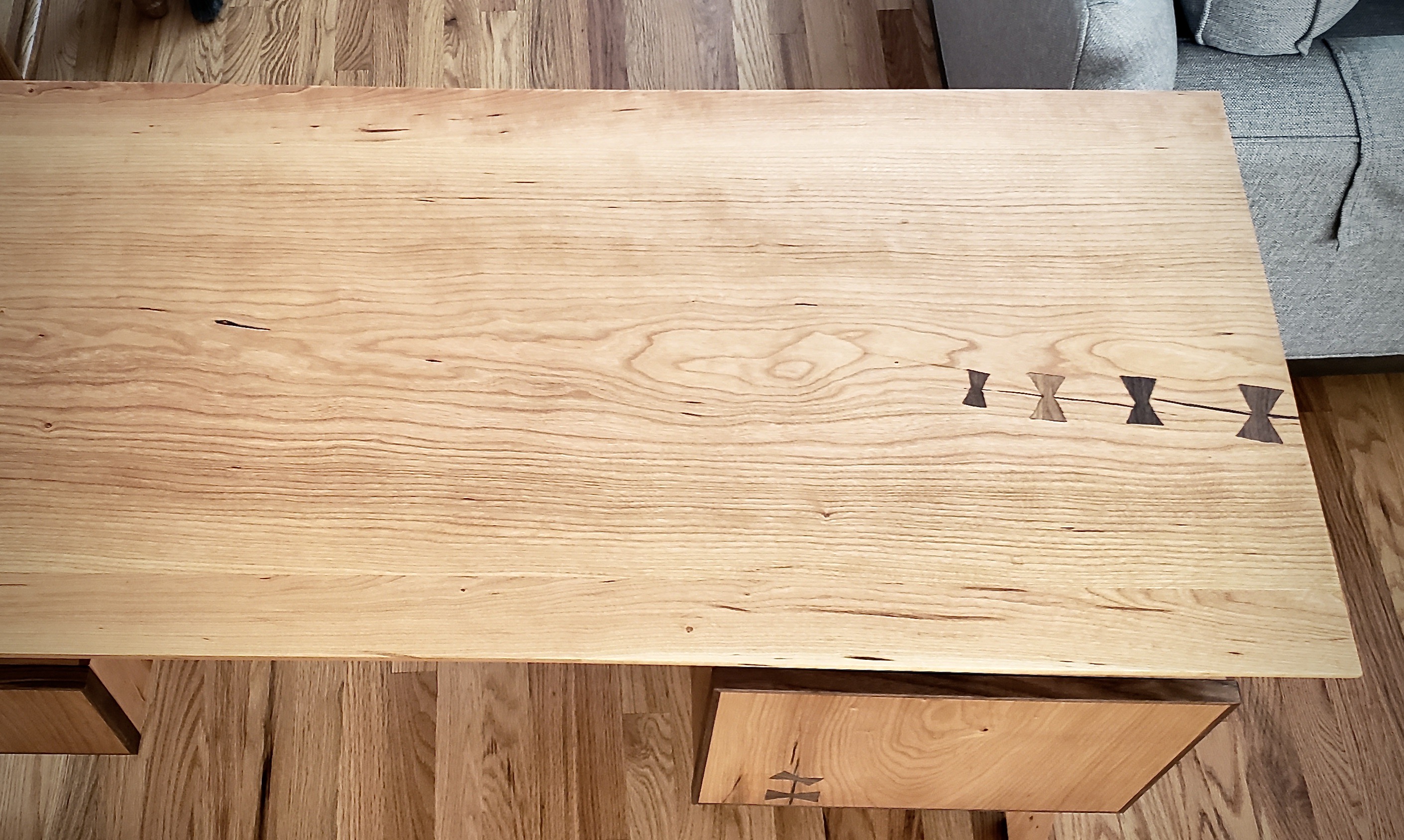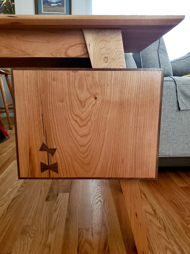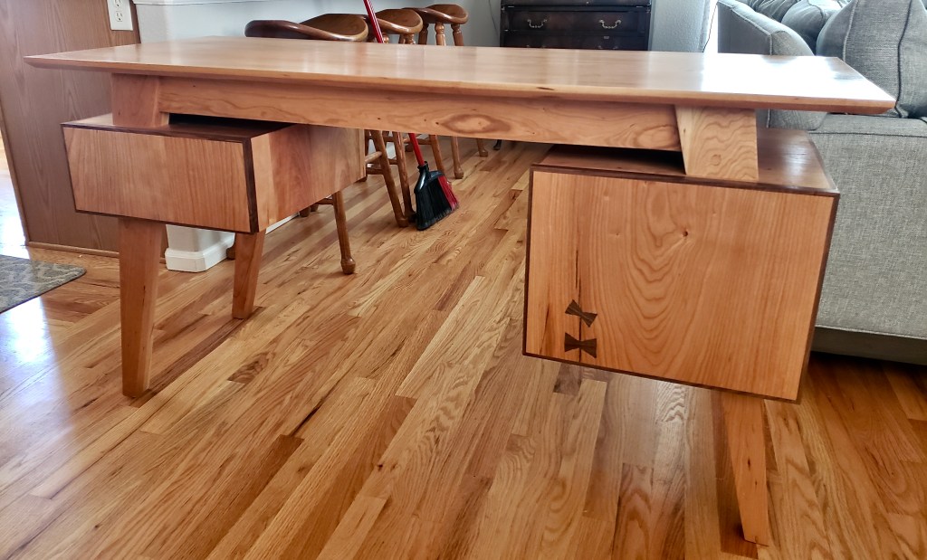When my daughter moved out of college dorms she needed a desk and asked me if I would help her build it. I said yes, if she designed it. She came up with three designs and this is the one we both liked most. Made, again, from cherry with walnut trim and bowties to stabilize the cracks that she wanted to incorporate. This desk features two drawers that “float” between the top and and ground with tapered legs and a beveled top. My daughter showed this to her art professor in class and he refused to believe she actually built this. Building projects with my children and seeing their commitment to detail inspires me every day.