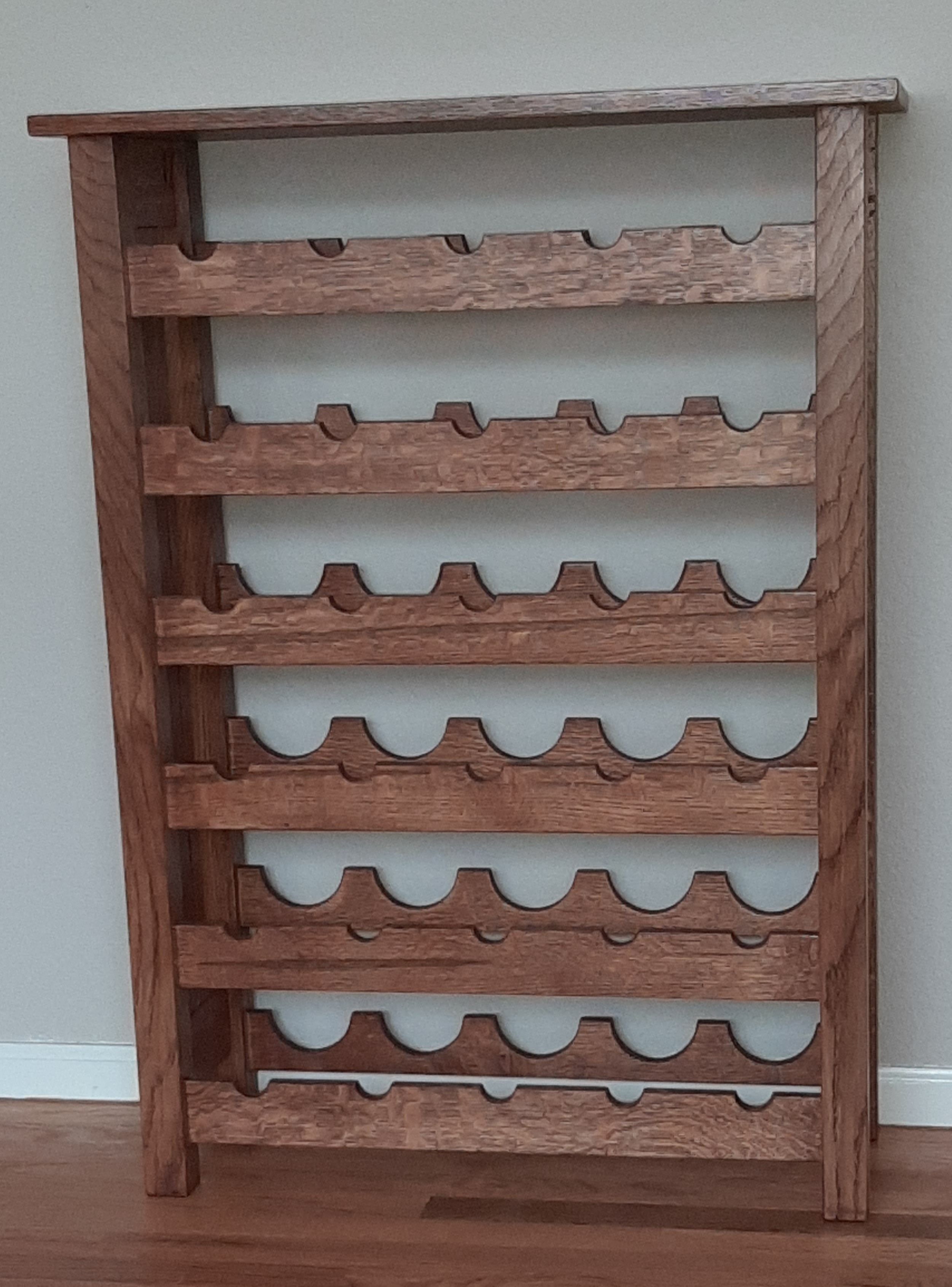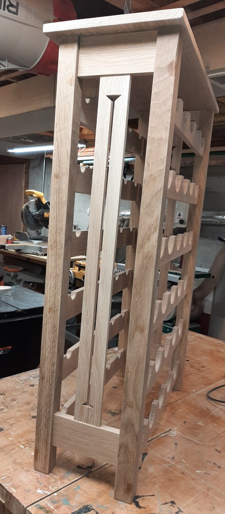This oak wine rack was requested and was to hold 36 bottles. I was a bit surprised at the quantity of bottles, but jumped in with both feet. My customers, and friends, were amazed at how well it turned out and the next time I saw the piece it was, indeed, full of wine. I am happy to report I have been lucky enough to have a glass of wine from a bottle stored in this rack and was it was very tasty.