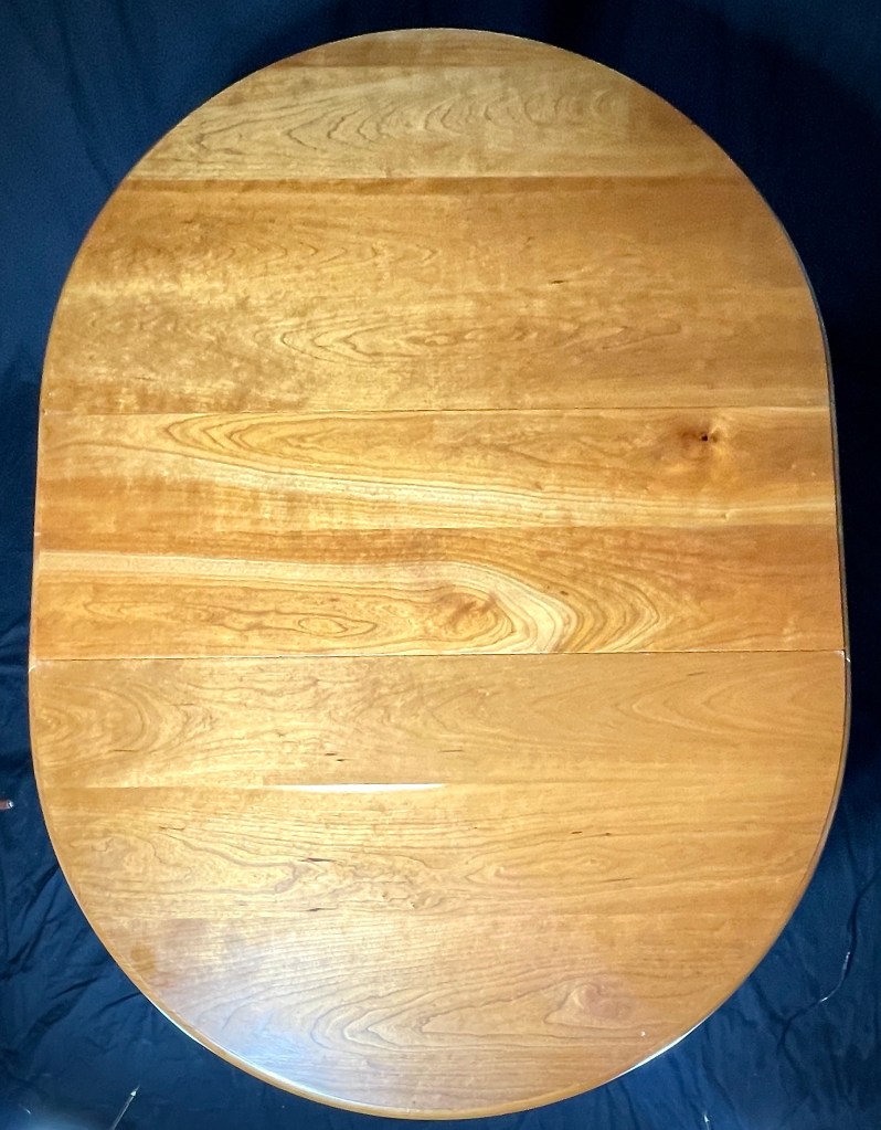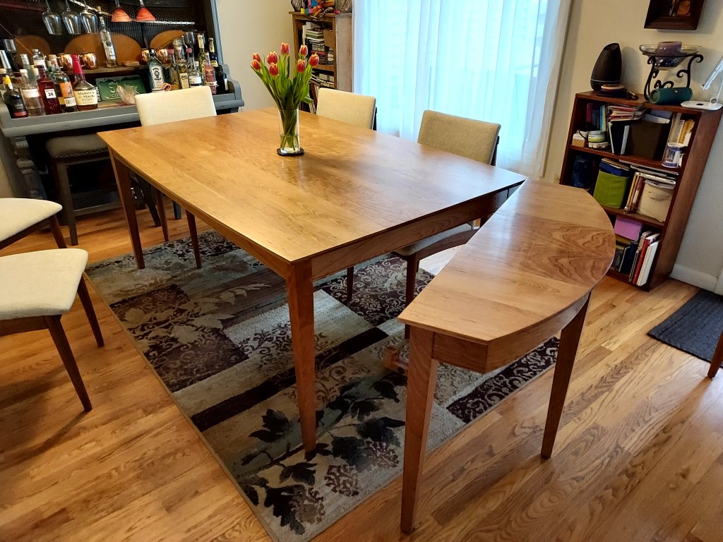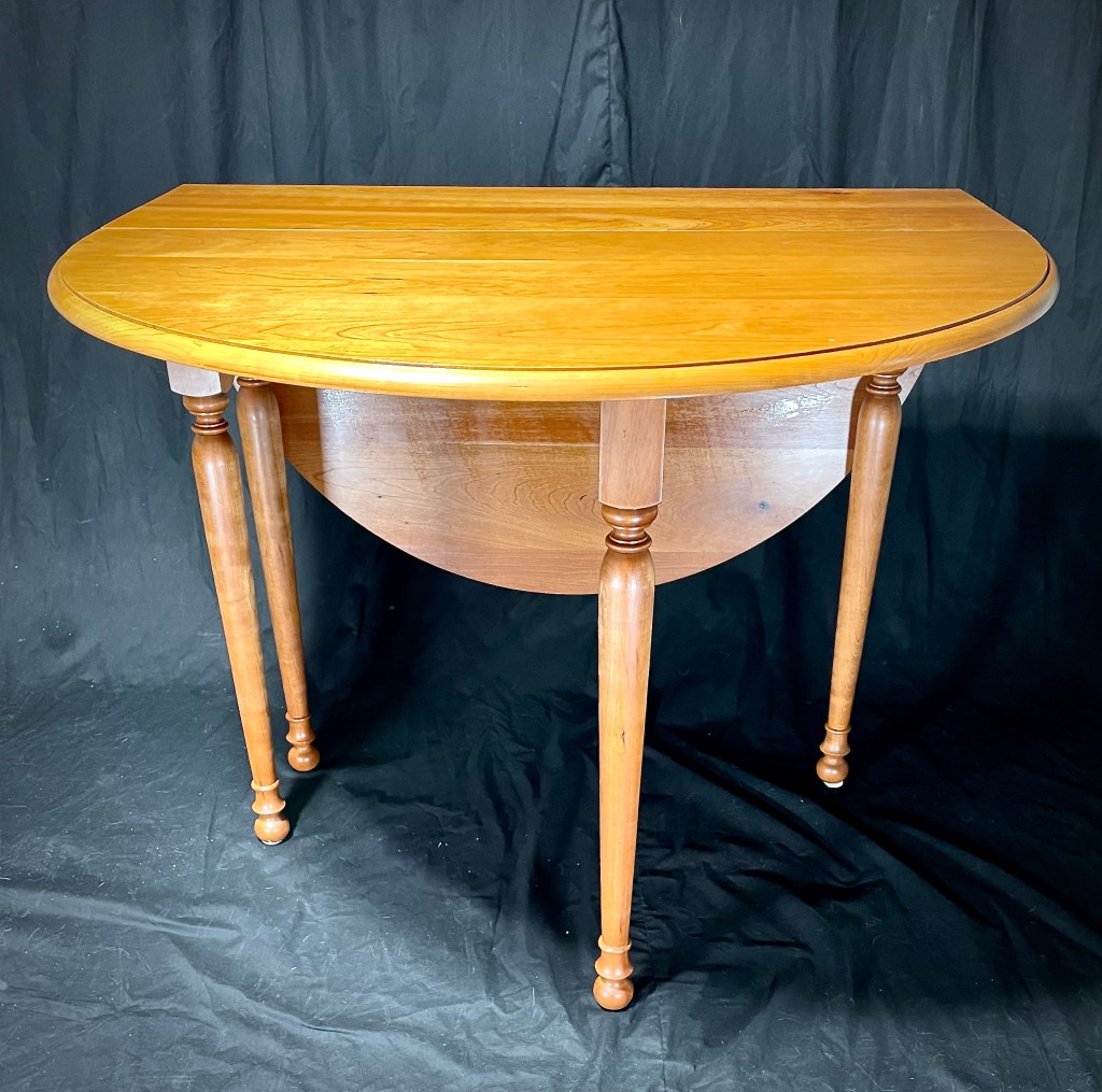 This dropleaf table was inspired by a table in my in-laws home that we continue to enjoy invaluable family time sitting around. As our family grew we needed to increase the size of our dining table so this project is the same height and width as the existing table we already owned. The tricky part of this project was creating the wooden hinges that allow for the legs to swing out and support the leaves. As it is made from solid Cherry, the table is continuing to develop a patina that gives the grain a deep rich look.