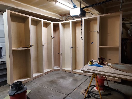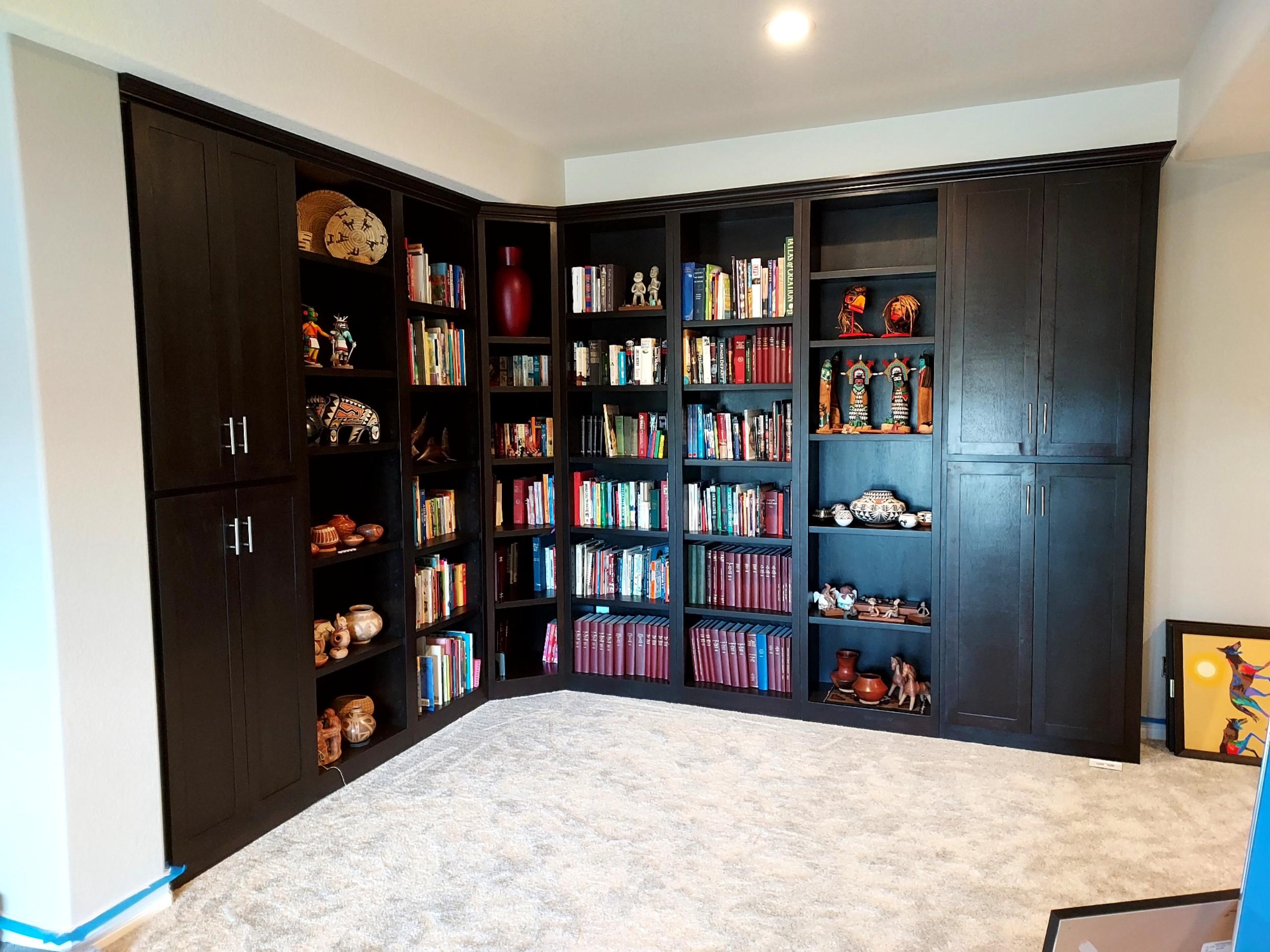 My son has joined the business and this was our first project together. This very large installation includes 5 bookcases, one corner display case, and two cabinets, all over 100 inches tall. The project was so big we had to turn my garage into a work shop for a whole month. We learned a lot from this build and the client was amazed at how well it turned out. We made everything from the shelves to the cabinet fronts. They even commented, “Wow, this is just like fine furniture.” We have several more projects now with this client and their friends due to the success and quality of this installation.
