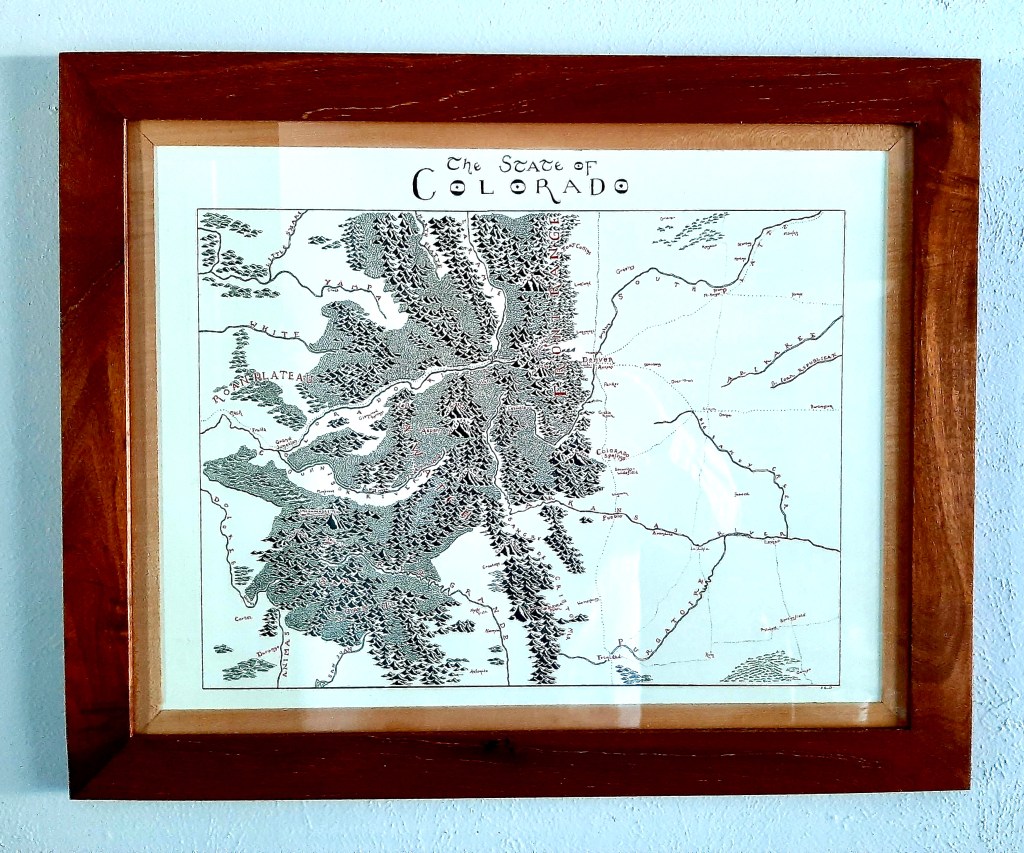 As a family, we love to frame our own work and work from others that we want to display. This map is of Colorado but done in the style of The Hobbit by J.R.R. Tolkien. The frame is from left over mahogany we used to build my younger son’s desk and some cherry strips left over from another project are being used as a frame liner. I enjoy being able to get the most out of the resources I have. Frequently this involves keeping scraps that I can then later use in other projects.