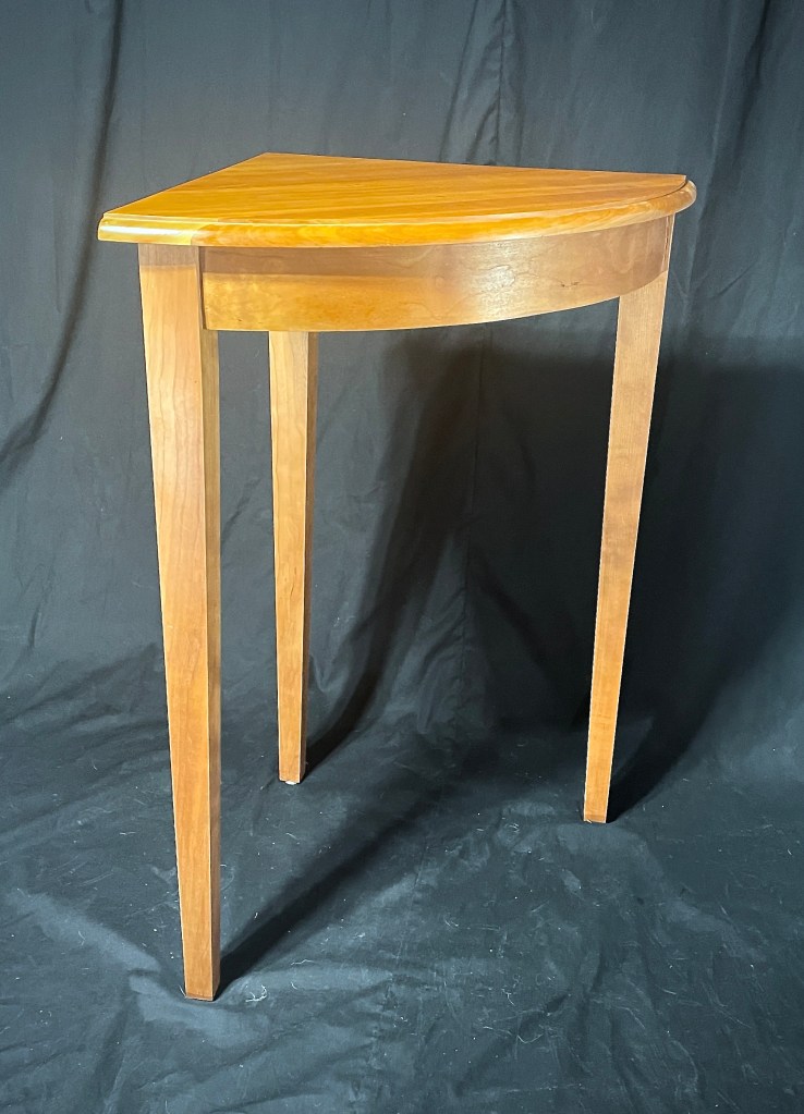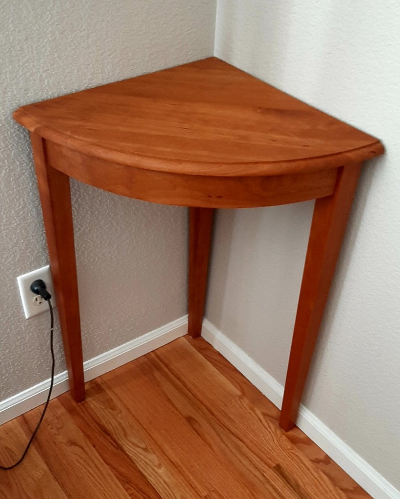 My bride of 35 years wanted a plant stand to fill a bare corner in our living room. This was my answer. This cherry corner table is perfect for a plant or other singular object. This project interested me a great deal as it allowed me to make a curved piece of wood for the first time.