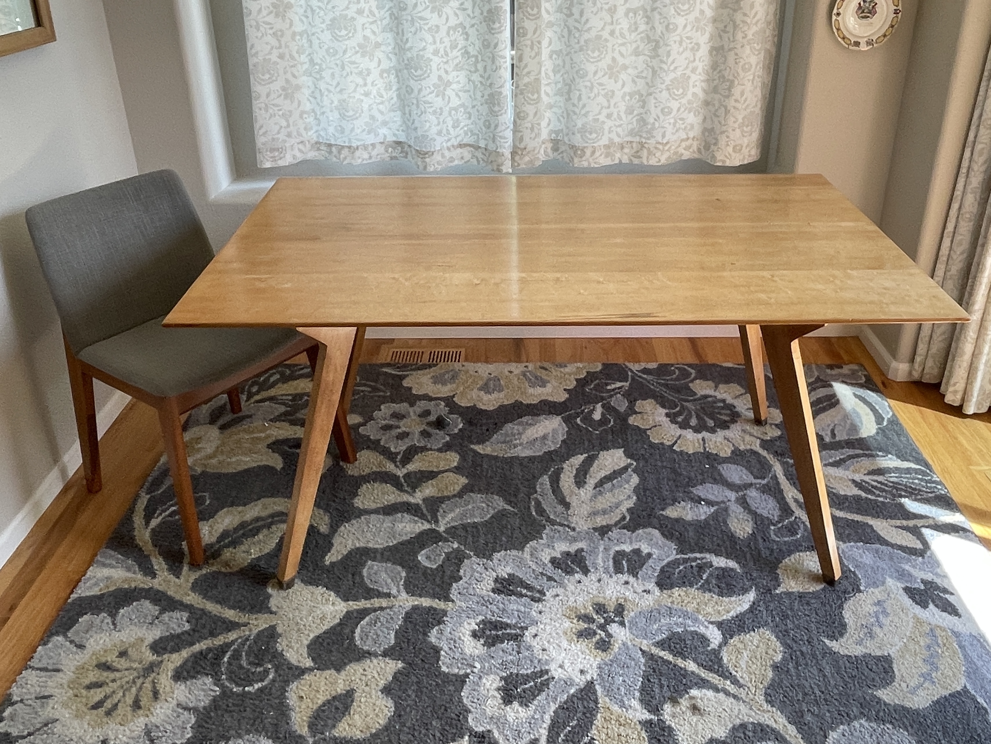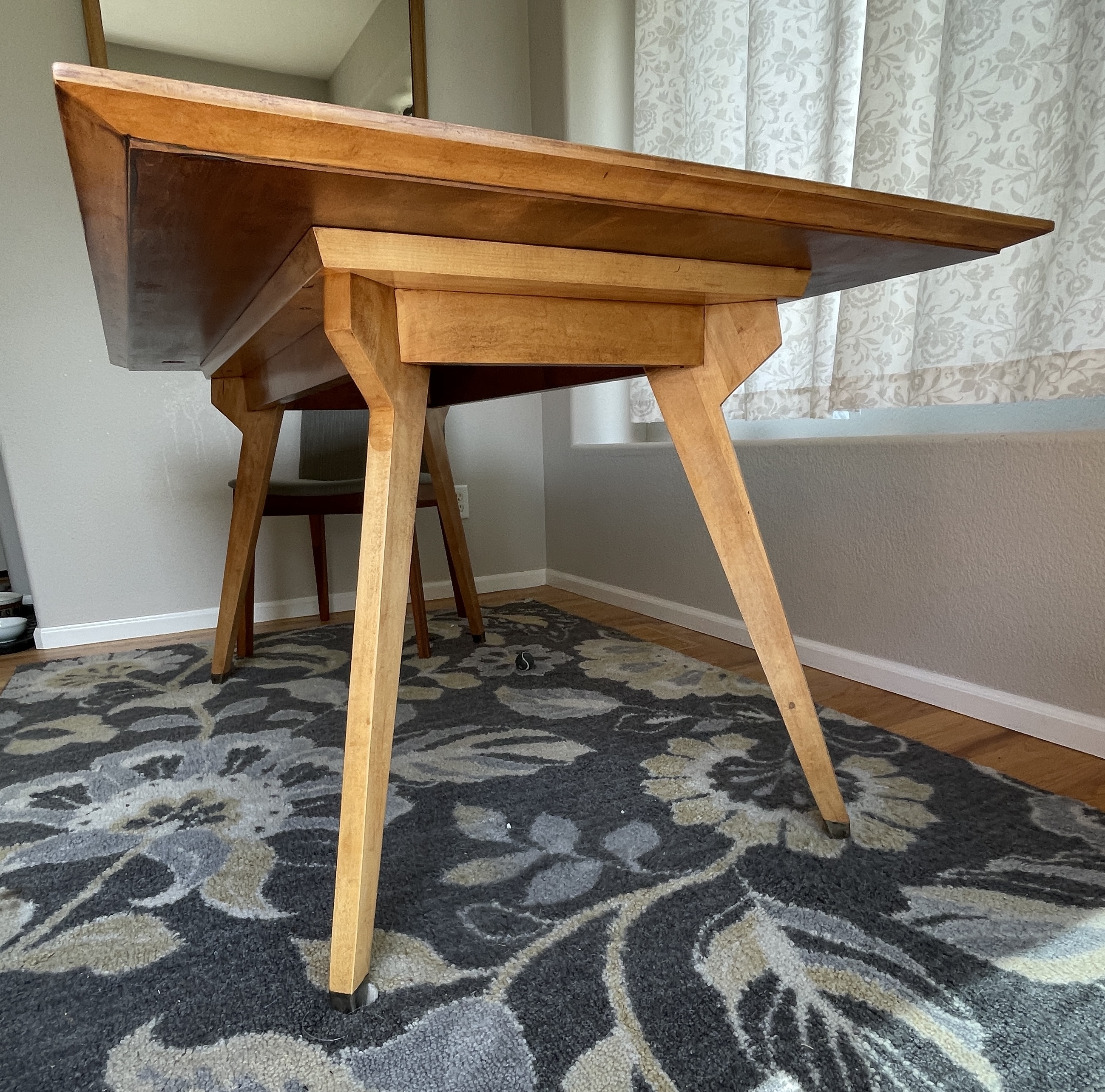 We had a great old oak table for this spot in our home. It was round and fit all five of us very nicely, but did not really fit the space. So long after the kids left our home I decided to make a table that better fit the space. Coming to help was my daughter who helped to design this highly angular solid rock maple kitchen table. Again, using upcycled lumber I was able to put this together, The interesting end to this story is that a friend of my wife loved this table so much she commissioned a smaller replica to use as a desk.