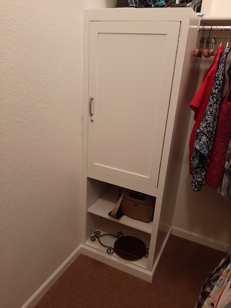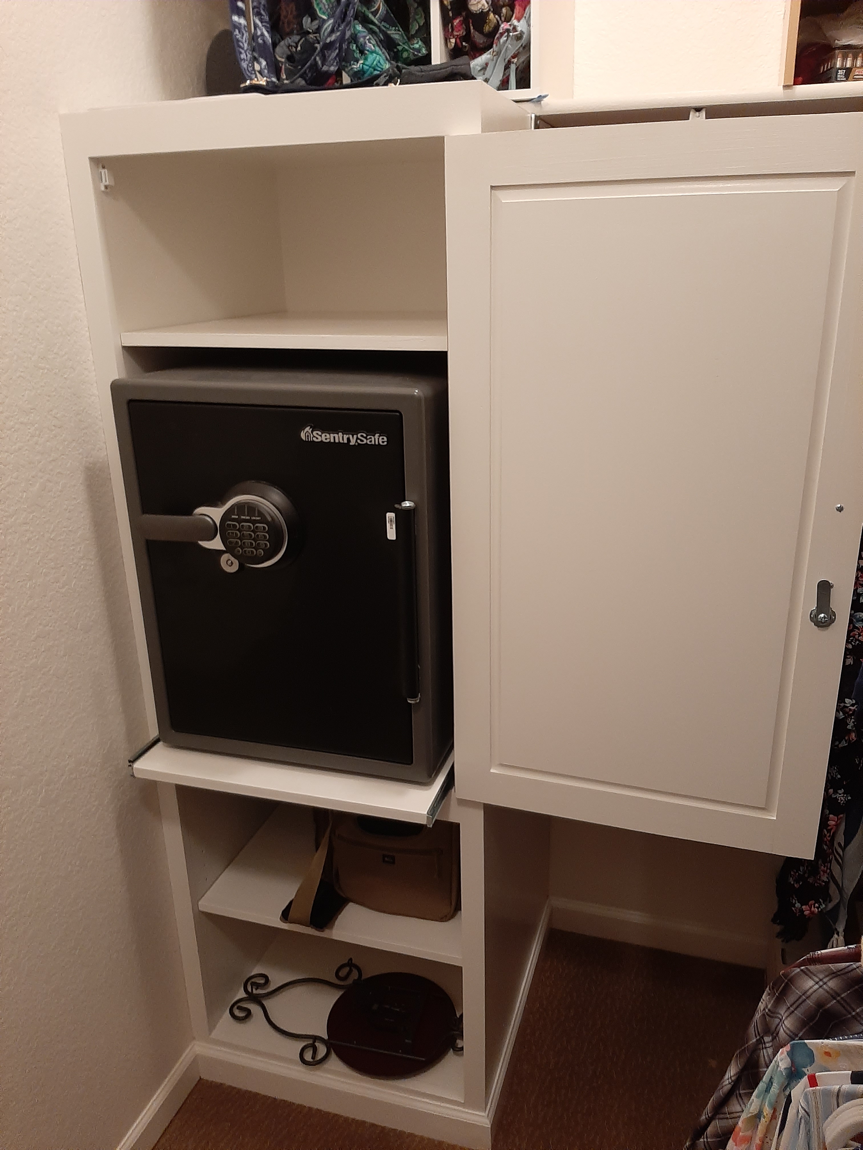 This client was getting tired of having to get down on her knees to use her safe and asked if I could lift it off the ground. This built in cabinet was my answer. Painted to match her trim and with a lockable door, this discrete cupboard has given my client access to her valuables without the challenges of getting down on the ground every time she wants to lock something up.