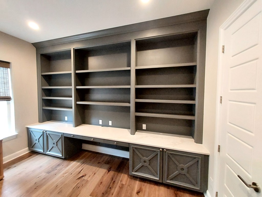 A Customer commissioned this large project to be built and installed in their home. This is a built-in desk and book cases that the customer had a piece of granite installed on to act as the desk top. We assembled and painted these cabinets in my workshop (and eventually my garage) and then we transported the pieces to the customer’s home and installed them. My son and I took great care in crafting, transporting, and installing these pieces so they would look would look perfect in this home.