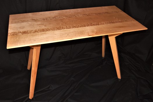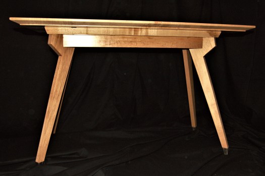 This project is a miniature (24” by 48”) version of the dining table my daughter designed and we built together. A friend of my wife saw the table and was eager to have a desk for her home that was identical. The desk is made from reclaimed rock maple and has a light mahogany finish. Though hard to see in this photo I particularly enjoyed making the metal feet on this project.